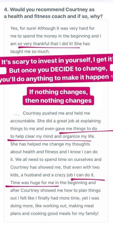 I lost 16.5 inches overall which is amazing, along with 5 pounds and 2% body fat. My energy has been great and I even became a morning workout person thanks to her help. I no longer have brain fog and hard end of day energy crashes. Although I've seen results when it comes to my size and weight, those are just bonuses compared to what I've overcome with my mindset towards nutrition and exercise. I no longer have those negative voices barking at me telling me I'm not good enough and my relationship with food is no longer toxic. It took hard work, some tears, and pushing buttons getting to this point mentally, but it was absolutely worth it.